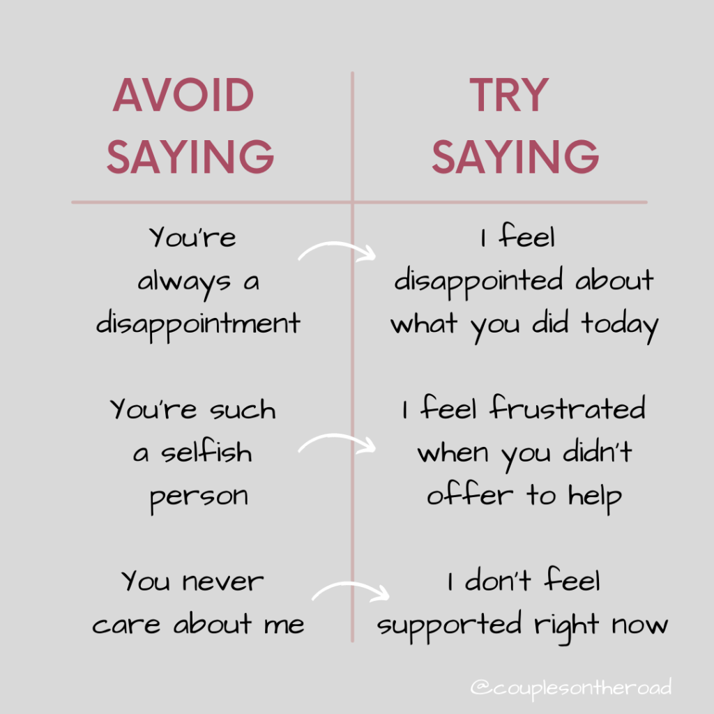 - Use more “I” statements than “you” statements. When things are heated, starting sentences with a “you” would often sound more like a criticism. Can you hear the difference between “You never care about me!” and “I don’t feel supported right now.”?